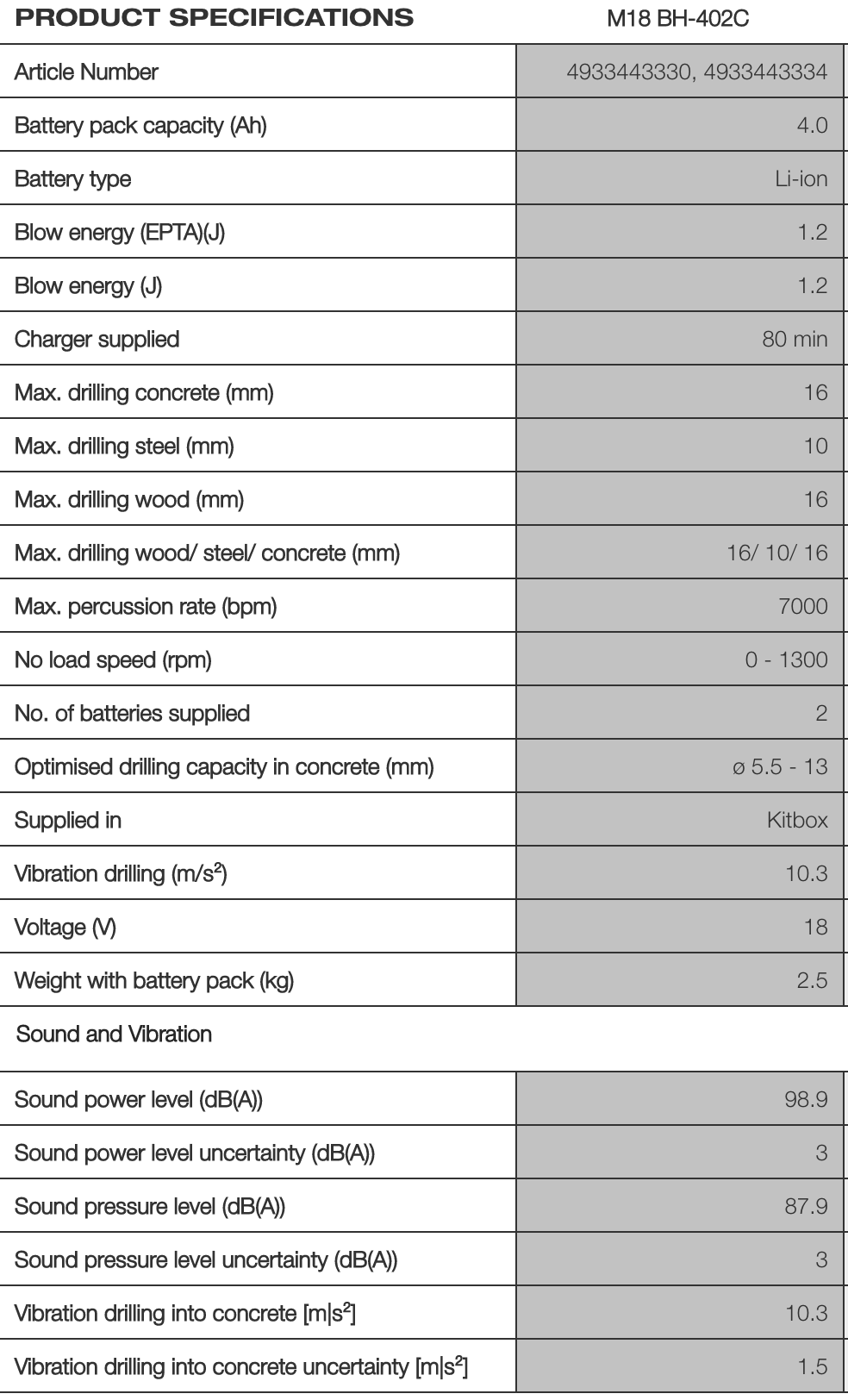 Superior power to weight ratio in its class 2.5 kg 1.2 J (EPTA) High performance 4-pole motor delivers maximum power whilst maximising the power to weight ratio REDLINK™ overload protection electron...